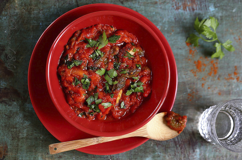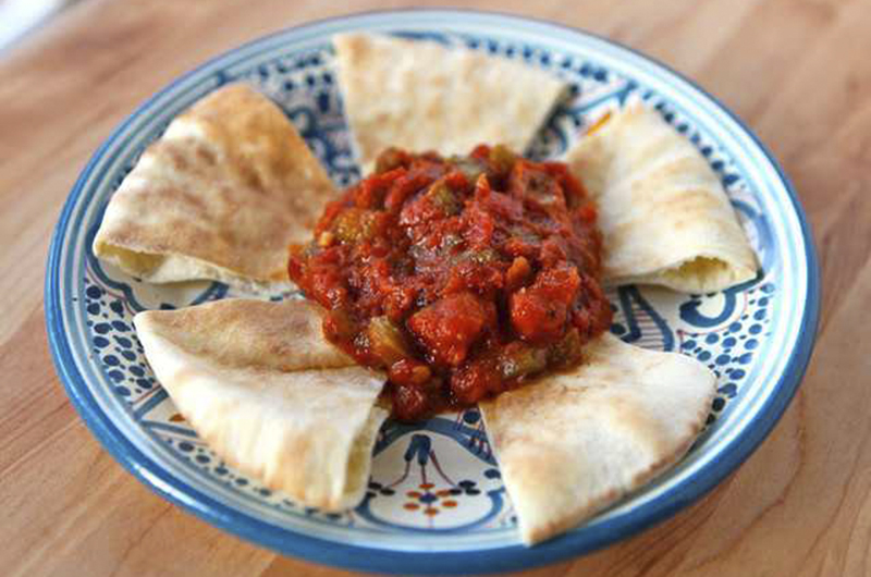 Емблематична мароканска салата – слънце в чиния. Бавно задушени домати и печени чушки се съчетават с чесън, зехтин и нежни подправки, за да се получи кадифена, леко опушена текстура. Поднася се топла или на стайна температура и е от онези ястия, към които винаги се връщаш – проста, жива и изключително удовлетворяваща.