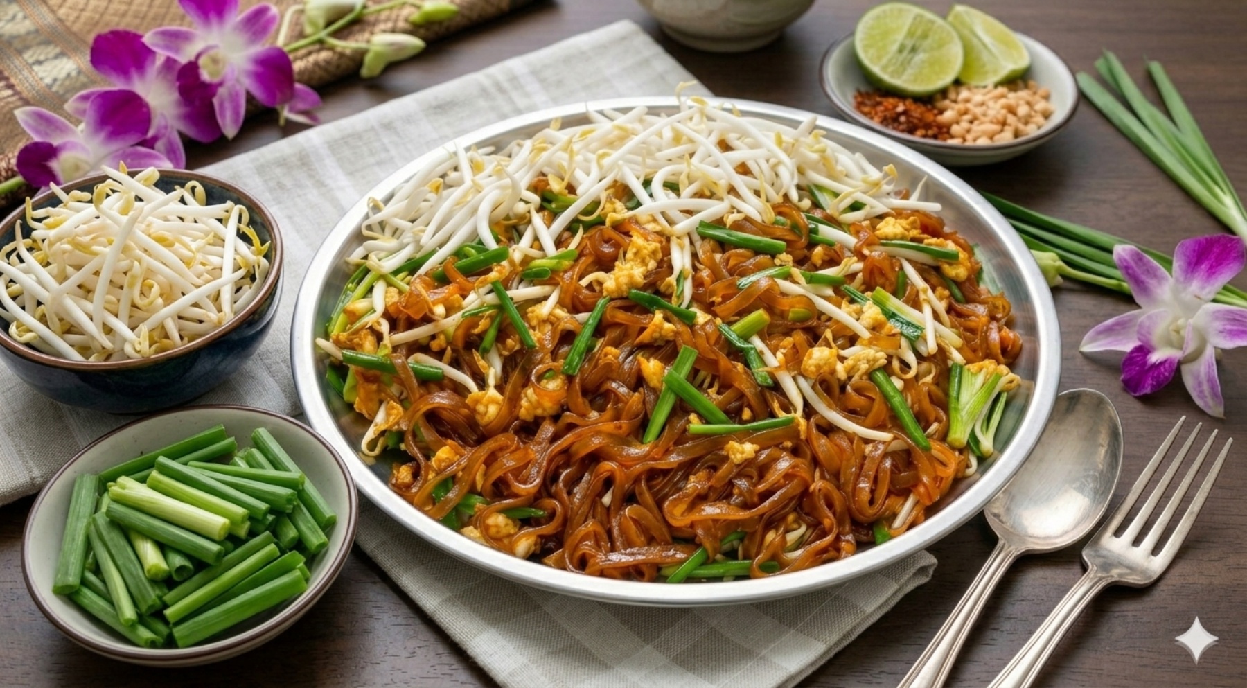 Едно от най-популярните тай ястия – тънки оризови нудъли, запържени със специален сос, докато станат меки и леко еластични, гарнирани с кълнове от боб мунг и пресен лук в автентичен тай стил, създавайки добре балансиран вкус на сладко, кисело и солено в перфектна хармония.