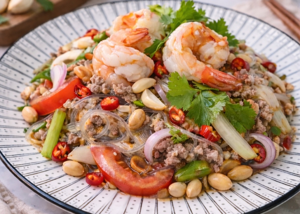Меките и прозрачни стъклени нудъли се смесват с дресинг, който балансира кисело, люто, солено и сладко, и се гарнират със скариди и прясно изпържени фъстъци, които придават ароматен и ядков завършек.