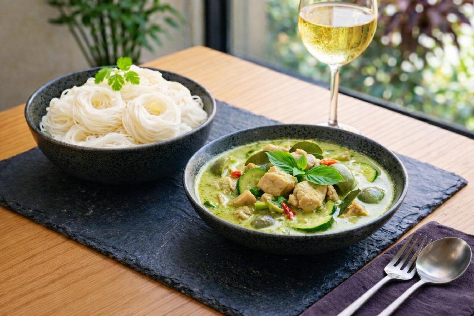 Свежо ароматно зелено къри с кокосово мляко, тиквички, пилешко месо и меки фини оризови нудъли (Khanom Jeen).