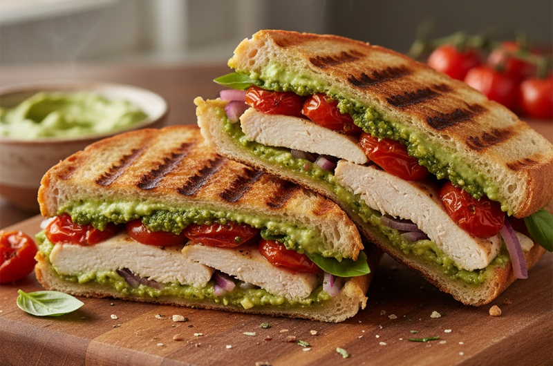 - Панини с пиле на грил, печени чери доматчета, домашно песто и айоли с авокадо – истинска гурме наслада