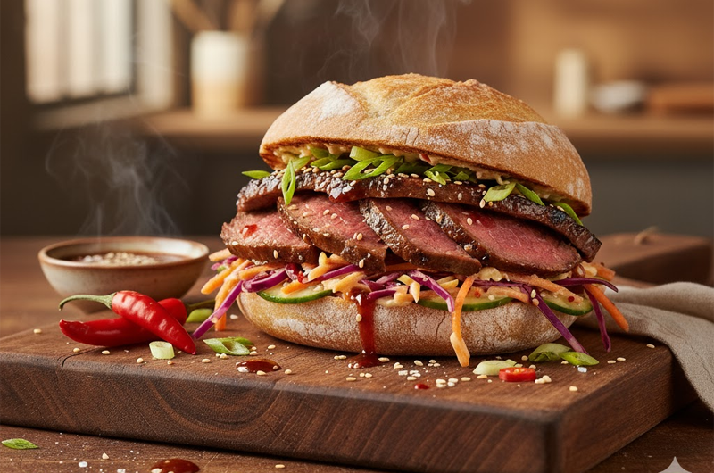 - Стек-сандвич в корейски стил – азиатска кулинарна магия с маринован телешки стек и пикантен ароматен сос