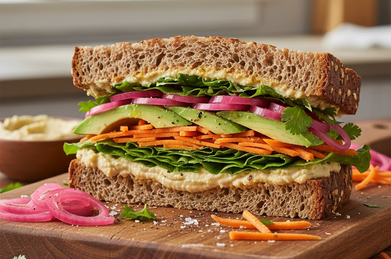 - Вегетариански сандвич с хумус, маринован лук, авокадо и моркови – хрупкаво, вкусно, цветно и здравословно предложение