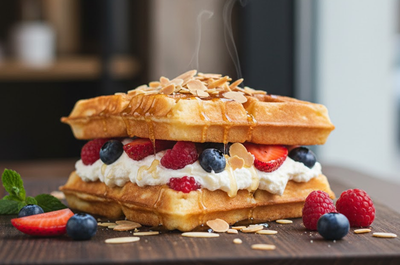 - Сладък сандвич-козуначена гофрета с маскарпоне, горски плодове и печени бадеми – перфектен сладък завършек за всяко гурме изживяване